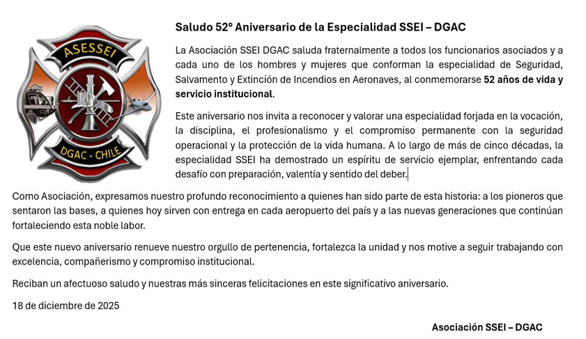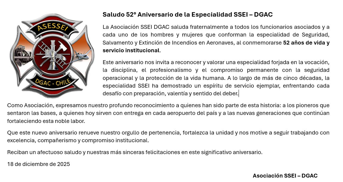 Bienvenidos al sitio web oficial de la ASOCIACION DE ESPECIALISTAS EN SEGURIDAD, SALVAMENTO Y EXTINCIÓN DE INCENDIOS DE LA DGAC CHILE, con base actualmente en el Aeropuerto Carriel Sur de Talcahuano.